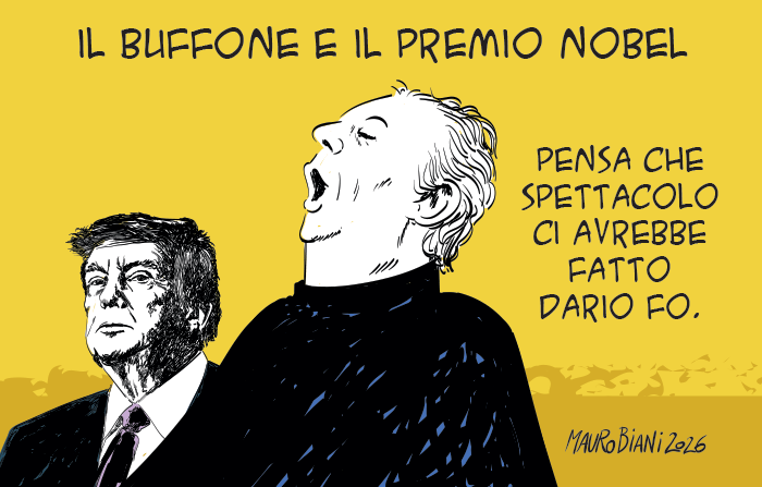 Domani col manifesto ci sono due prime pagine per Dario Fo e Bob Dylan, quindi pure due vignette (1 e 2). Sarebbe assurdo non prenderlo. Fate voi.