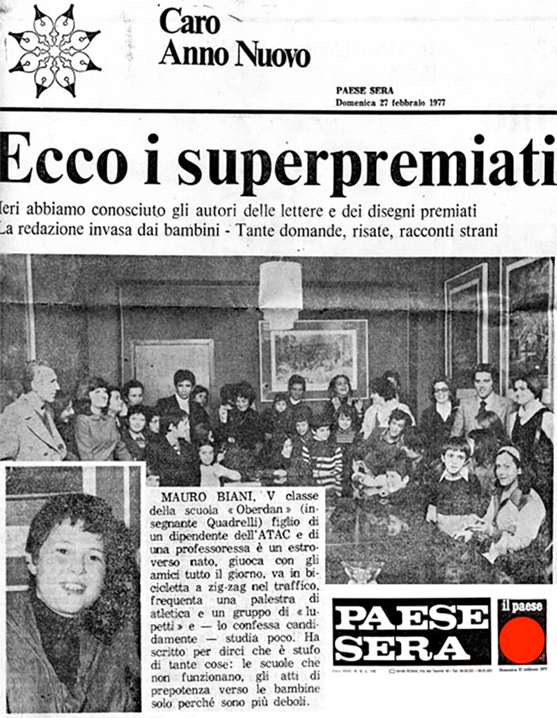 Come i notturni filmati di raitre, ricordo ricordi che poi non è che mi paiono così lontani. C’era Paese Sera, il mitico quotidiano che si leggeva in famiglia (ci aveva scritto Pasolini, ci scriveva G. Rodari, per citare i primi 2 nomi che mi sovvengono e muovevano i primi scarabocchi: Ellekappa, Forattini, Perini, etc…), e Paese Sera tutti i fine anno promuoveva un concorso per bambini: “Caro anno nuovo…” alla ricerca di speranze, aspettative per l’anno nuovo. Partecipai, e mi ritrovai tra i premiati in redazione per ritirare il trofeo: un sacco pieno di giochi e un invito al circo. Formidabile quel 1977.